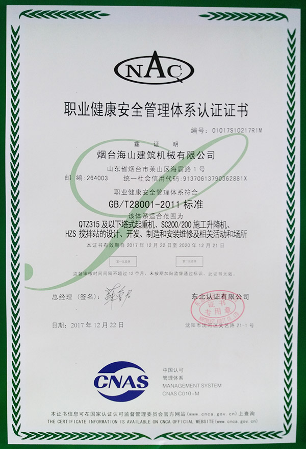 職業(yè)健康安全管理體系認(rèn)證證書(shū)